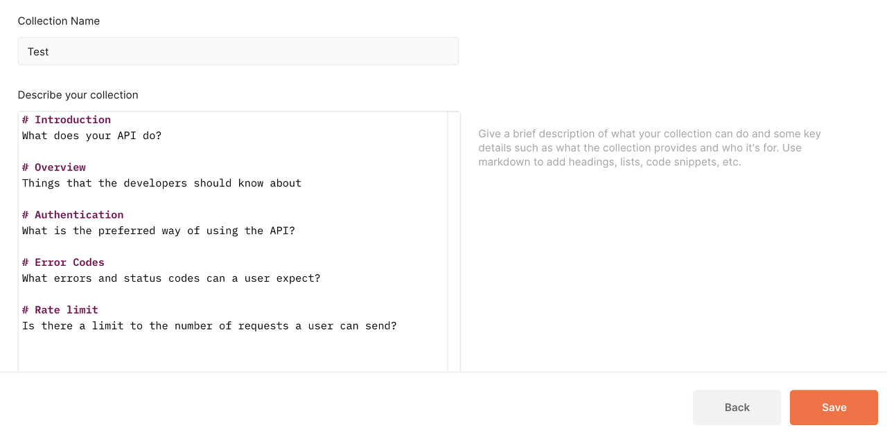 그리고 위 사진의 오른쪽 공간을 보면 Documentation 부분이 보이는데 저 부분에는 해당 Request가 어떤 역할을 수행하는지 설명하는 부분이다. (Markdown Language 를 지원한다.)
