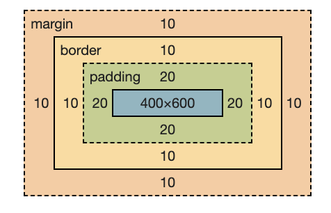 - 실제 너비 : 400px + 40px(padding의 좌,우 20px) + 20px(border의 좌,우 10px) + 20px(margin 좌,우 10px) = 480px