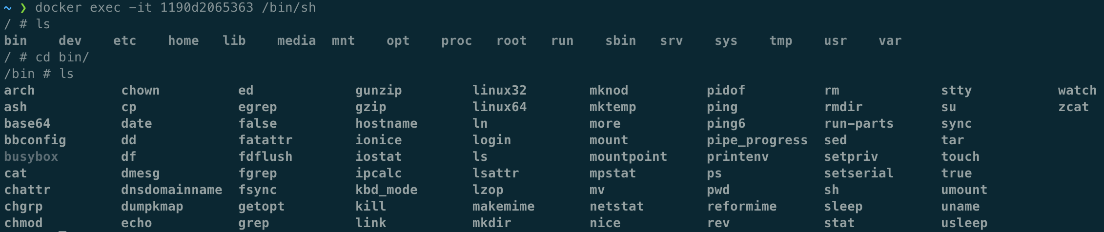 exec 명령어 뒤에 -it 옵션을 추가한다. 또한, alpine 이미지는 bash쉘이 아닌 sh쉘을 사용하기 때문에 /bin/sh 경로로 접속하면 된다.