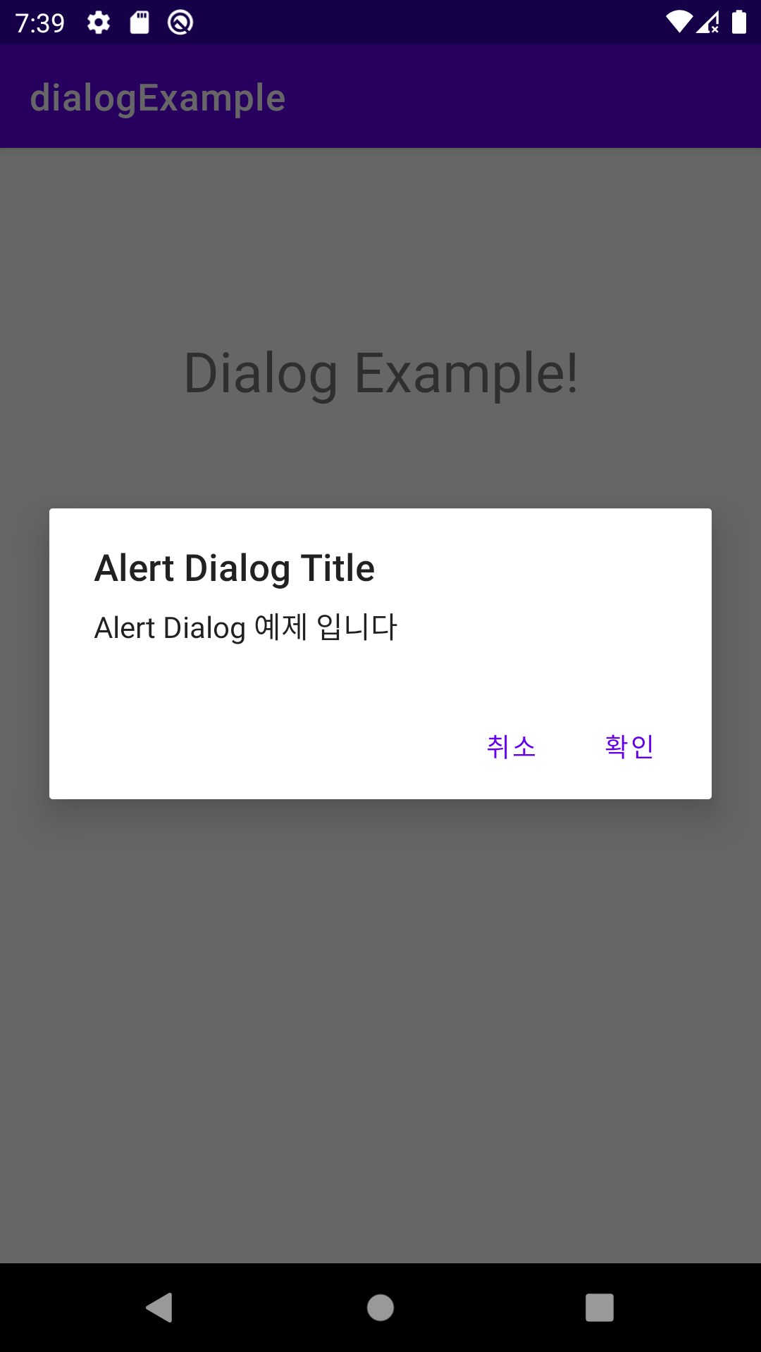 마찬가지로 확인 버튼이 아니라 취소 버튼을 클릭한다면 TextView의 문자가 취소 버튼을 클릭함 으로 바뀌는 것을 확인할 수 있을 것이다.