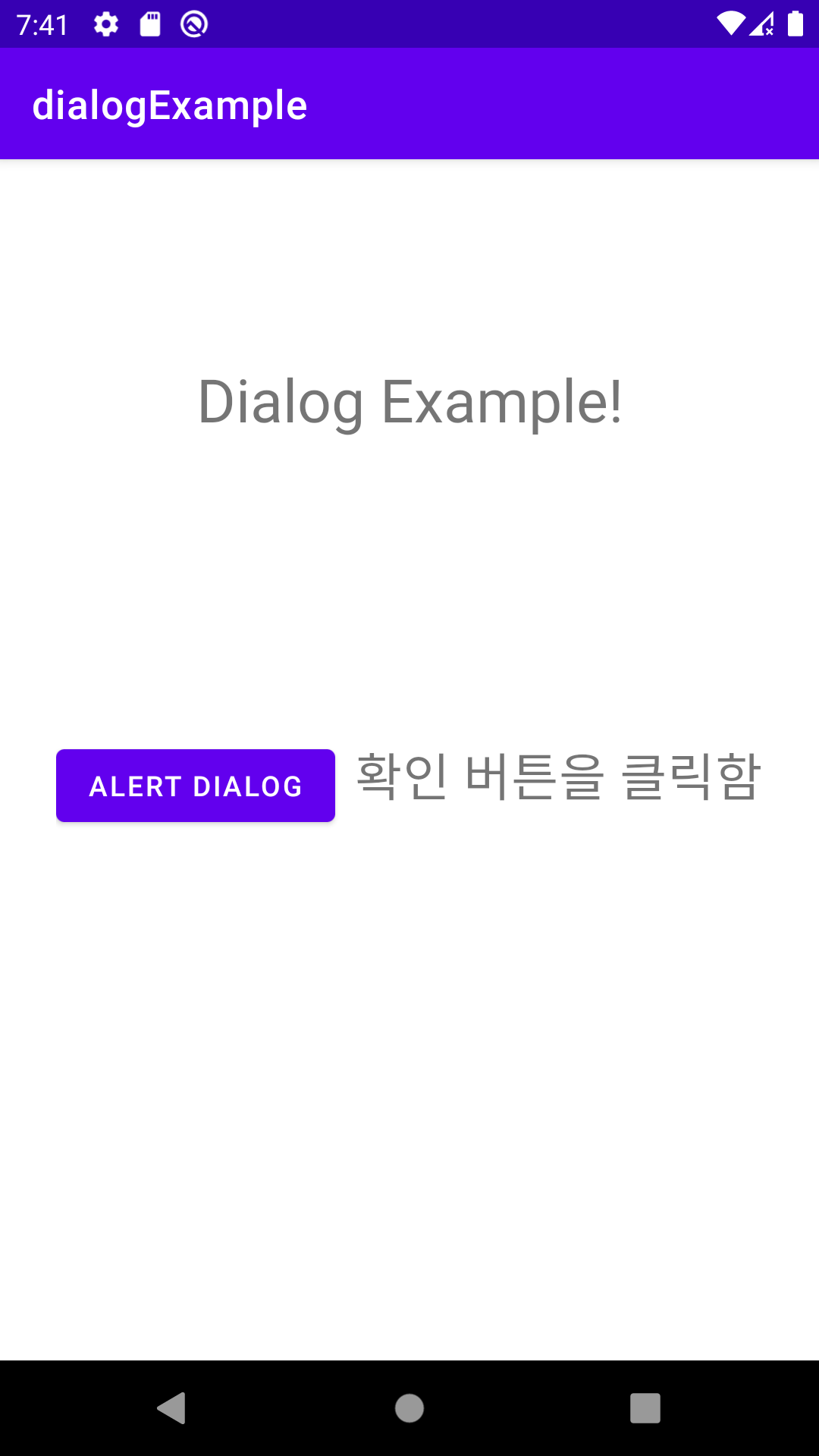 이번 예제에서는 ALERT DIALOG 버튼을 눌렀을 때 다이얼로그가 생성되고,