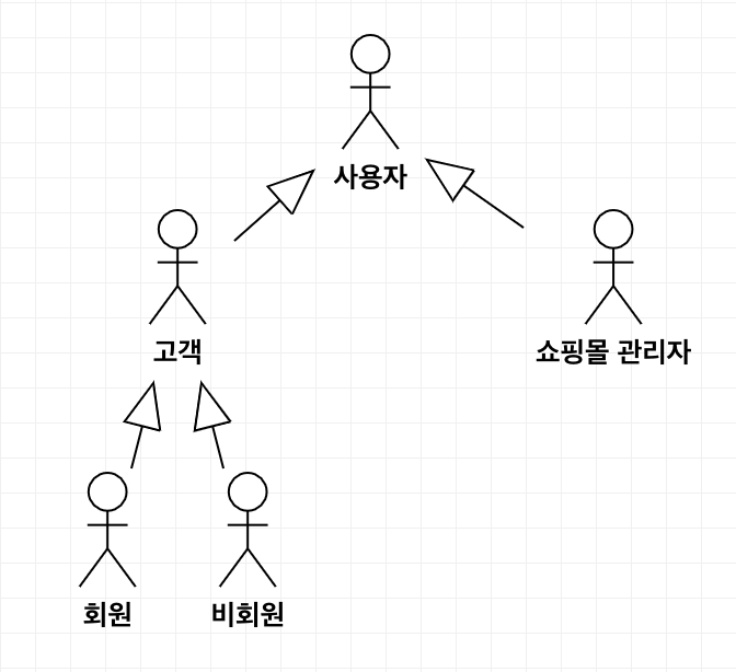 | 일반화(Generalization) 관계 | - 추상적인 액터와 좀 더 구체적인 액터 사이에 맺어주는 관계 - 일반화 관계를 사용하면 액터들의 의미를 좀 더 명확하게 표현 가능 - 하위 액터, 유스케이스에서 상위 액터, 유스케이스 쪽으로 속이 빈 삼각형 화살표를 실선으로 연결하여 표현 |