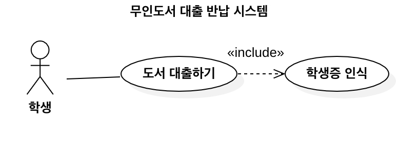 학생이 도서를 대출하기 위해서는 학생 신분을 증명해야 한다. 따라서 학생증 또는 QR코드 인식 이라는 유스케이스가 포함 관계(include)로 연결되어 있는 것을 확인할 수 있다. 해당 유스케이스의 목적이 달성되어야만 학생은 도서 대출을 수행할 수 있다.