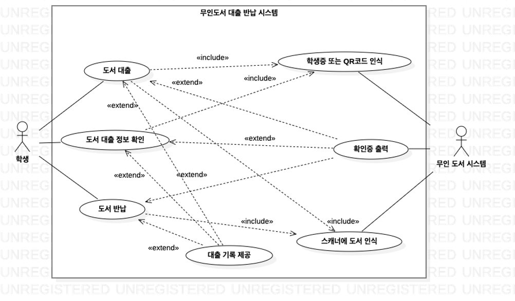 마지막으로 스캐너에 도서 인식 이라는 유스케이스는 학생이 대출할 도서를 스캐너에 인식하기 위한 유스케이스이다. 해당 시스템은 무인도서 시스템이므로 책을 사서를 통해 대출할 수 없다. 따라서, 도서를 대출하기 위해서는 해당 도서를 스캐너기에 반드시 인식해야 하기 때문에 해당 유스케이스는 도서 대출하기와 포함 관계(include)로 연결된 것이다.