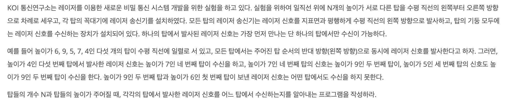 맨 뒤에서부터 완전 탐색 방식으로 구현하였으나 시간초과가 발생하였다. 탑의 개수가 최대 50만개 이므로 브루트 포스 알고리즘을 이용하면 풀 수 없다는 것을 알았다.