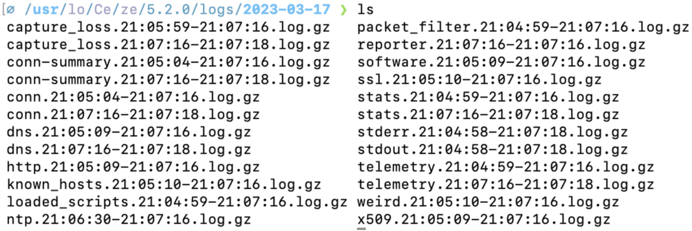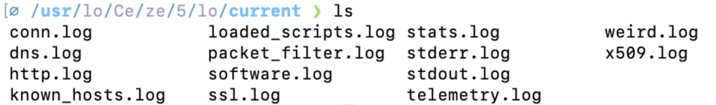 위와 같이 지크가 실행되면 /usr/local/Cellar/zeek/5.2.0/logs 안에 current 라는 디렉토리가 생성된다.