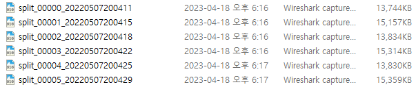 분할된 파일은 editcap.exe 파일이 있는 디렉토리 내에 생성된다. 결과는 다음과 같다.