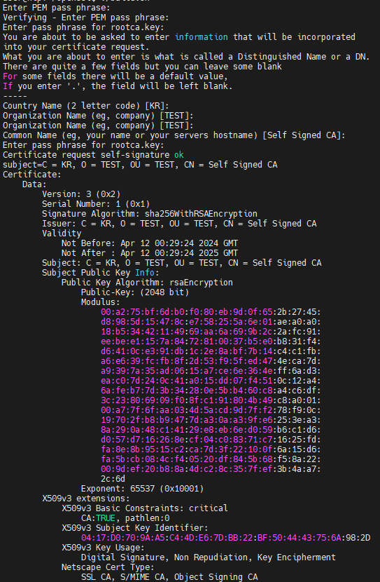 - rootca-crt.pem 및 rootca-key.pem 파일은 rootca.crt 및 rootca.key 파일을 기반으로 생성된 파일이므로 인증서 내 내용은 동일하다.