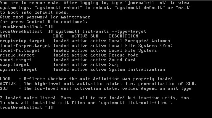 아래 그림은 systemctl list-units --type=target 명령어를 입력하여 rescue.target이 활성화 되어 있는지 확인하는 그림이다.