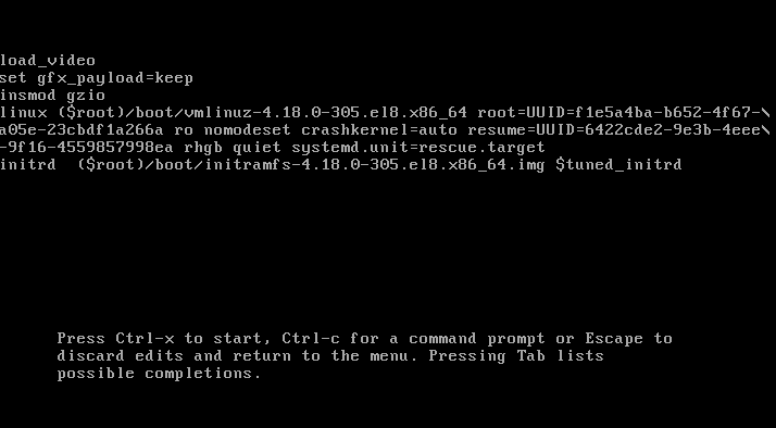 systemd.unit=rescue.target 명령어를 추가한다. 그 다음으로는, Ctrl + X를 함께 누른다.