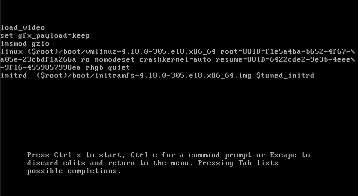 알파벳 e 버튼을 누르면 아래와 같은 화면이 나온다. 우리는 여기서 linux ($root) ..{이하생략}.. 부분의 맨 끝에 명령어를 추가할 예정이다.
