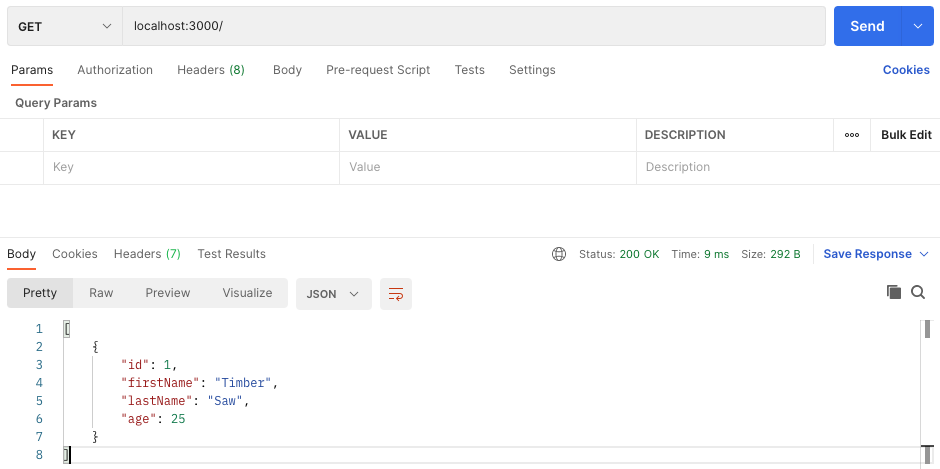 포스트맨으로 localhost:3000 경로에 GET 요청을 보내면 다음과 같이 User테이블에 저장된 데이터가 적절하게 출력되는 것을 확인할 수 있다.