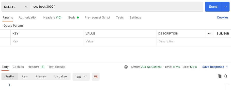 데이터를 삭제할 때는 delete() 메소드를 이용한다. 또한 데이터를 삭제할 때 조건을 주지 않으면 모든 데이터가 삭제될 수 있으므로 위와 같이 조건을 주어 필터링된 데이터만을 삭제해야 한다. 포스트맨을 통해 살펴본 결과는 다음과 같다.
