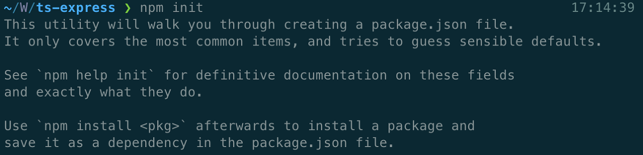 필자는 ts-express라는 디렉토리에서 패키지를 생성했다. 패키지를 초기화 할 때는 다른 옵션을 건드리지 않고 엔터를 눌러 넘어갔다.