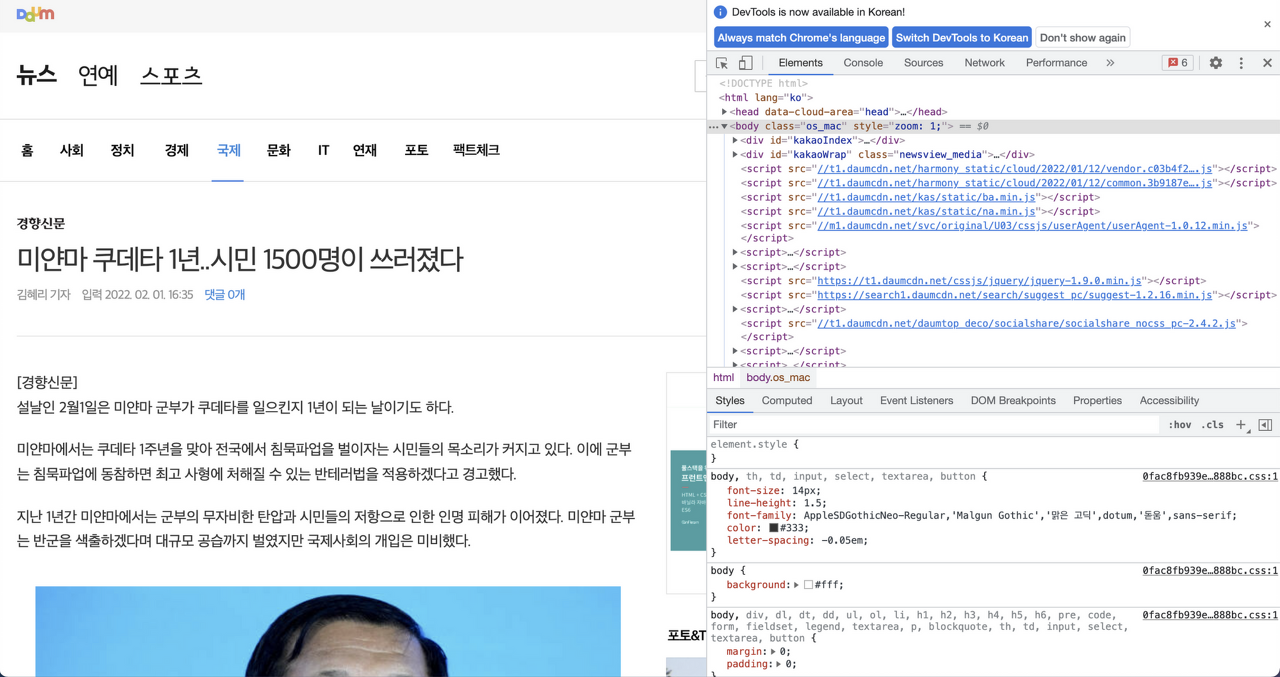 실제로 tit_view라는 클래스 명을 가진 태그 안에 우리가 가져온 기사 제목이 있었는지 확인하기 위해서는 크롬의 검사 페이지를 이용하면 쉽게 찾아볼 수 있다. 먼저 해당 웹사이트에서 마우스 오른쪽을 클릭 후 검사 탭을 클릭하거나 F12 를 누르면 다음과 같은 화면이 나타난다.