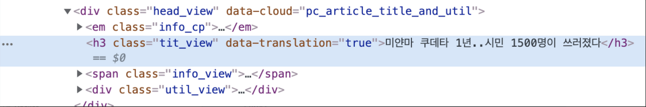 h3태그의 클래스명이 tit_view인 것을 확인할 수 있으며 값으로 기사 제목이 있는 것을 확인할 수 있다.