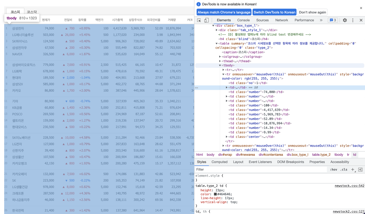 구조를 CSS selector로 나타내보면 삼성전자 라는 텍스트는 tbody > tr > td:nth-child(2) > a로 구성된 것을 알 수 있다.