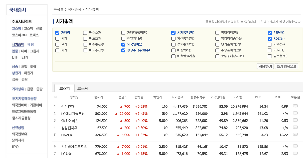 해당 페이지로 들어가면 코스피에 상장된 기업들이 시가 총액 순으로 정렬된 페이지가 나타난다.