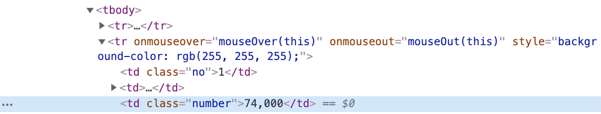 부모안에 모든 요소 중 n번째 요소를 나타낸다. 예를 들어 위의 경우를 살펴보면 2번째 tr태그 밑에는 여러 개의 td태그가 존재한다. 그 중에서 우리는 종목명을 가져와야 한다. 종목명은 tr태그 아래에 2번째 td태그에 속해 있으므로 td:nth-child(2)를 통해서 값을 가져올 수 있다.