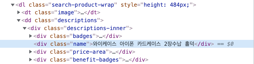 위 사진으로 보면 상품 이름의 셀렉터는 dl > dd > div > div.name로 정의될 수 있으며 필자는 간단하게 div > div.name으로 정의한 것이다.