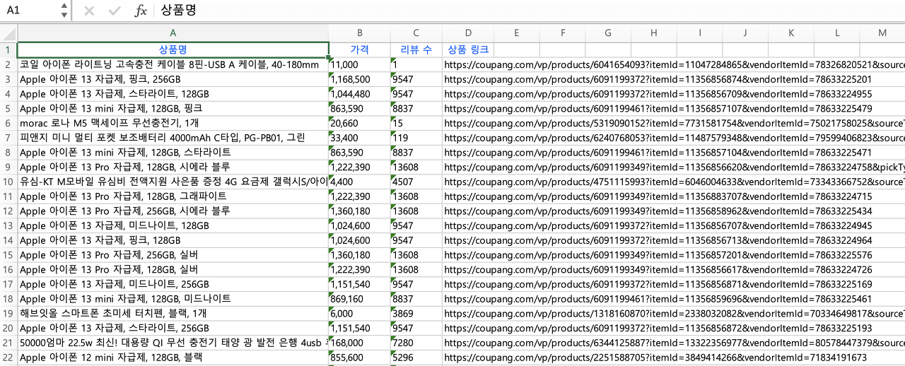 이런 식으로 /vp/..처럼 구성되어 있다. 따라서 완성된 주소로 변경하기 위해 앞에 https://coupang.com을 붙여서 해당 상품의 주소 데이터를 가공했다. 위처럼 코드를 구성하고 실행하면 coupang_item_list.xlsx 파일이 생성된다.