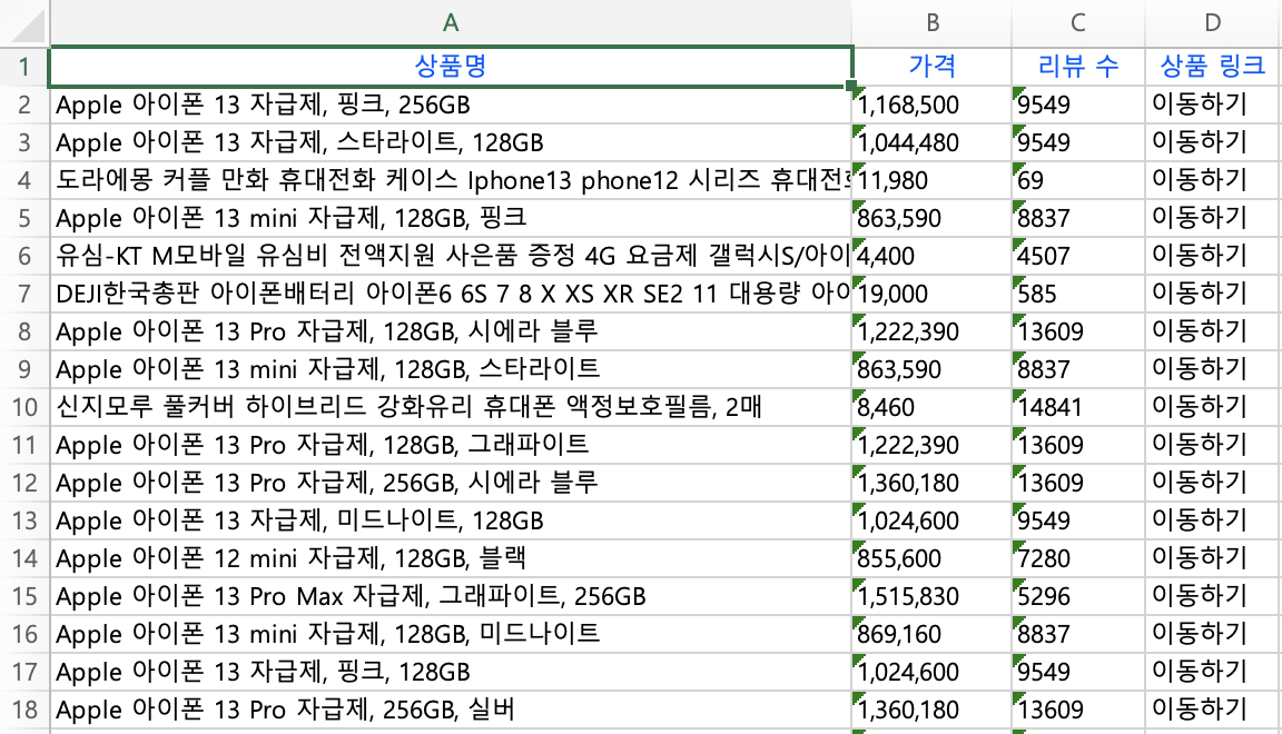sheet.append([p_name, p_price, p_review_cnt, '이동하기'])