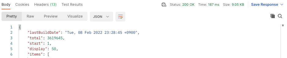 데이터 결과는 양이 많아 생략했으며 display 값이 50으로 나온 것을 보아 데이터 50개를 결과로 잘 받을 것을 확인할 수 있다.