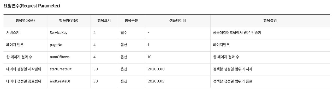 여러 쿼리 변수를 추가하기 위해서는 뒤에 요청 주소 뒤에 &기호를 이용하여 사용할 변수를 추가하면 된다. 예를 들어 데이터 생성일 시작범위(startCreateDt), 데이터 생성일 종료범위(endCreateDt)을 추가하고 싶다면 기존 주소에서 &startCreateDt=...&endCreateDt=... 이런 식으로 쿼리 변수를 추가하면 된다.