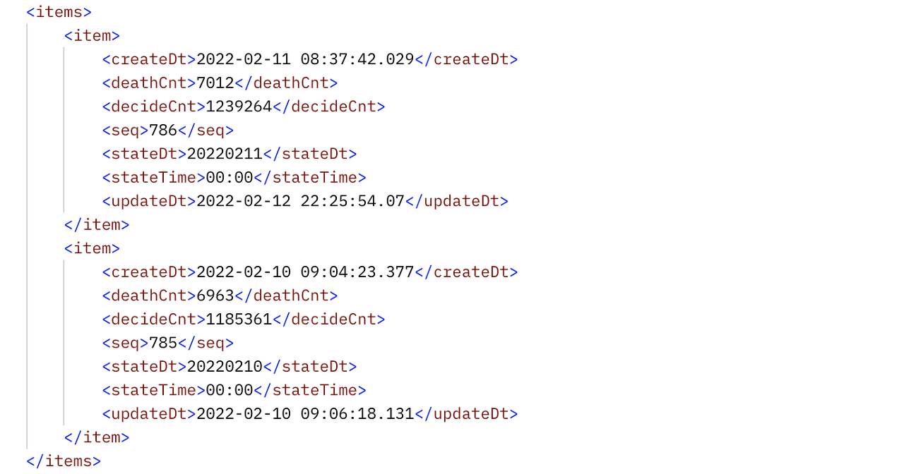 응답 코드 200과 함께 XML 형식으로 된 데이터가 반환되었다. 서비스키를 제외한 다른 옵션은 추가하지 않았으므로 데이터가 1개만 반환된 것 같다. 옵션을 추가하지 않았을 때는 당일 날짜 기준으로 데이터를 가져오는 것 같았다. 누적 사망자, 누적 확진자, 데이터 생성 날짜 등의 정보가 들어가 있는 것을 확인할 수 있다.