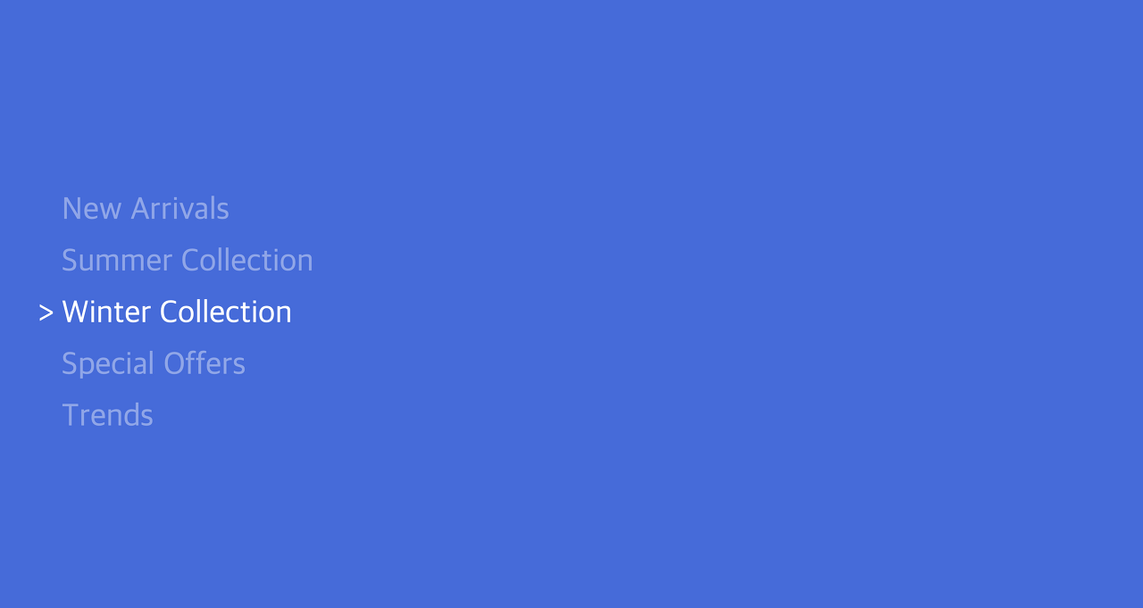 이처럼 Winter Collection에 마우스를 올렸을 때 해당 탭에 >부호가 생겨 해당 탭을 가리키고 있다는 것을 표시하고 있으며 나머지 4개 메뉴들은 색깔이 연해진 것을 확인할 수 있다.