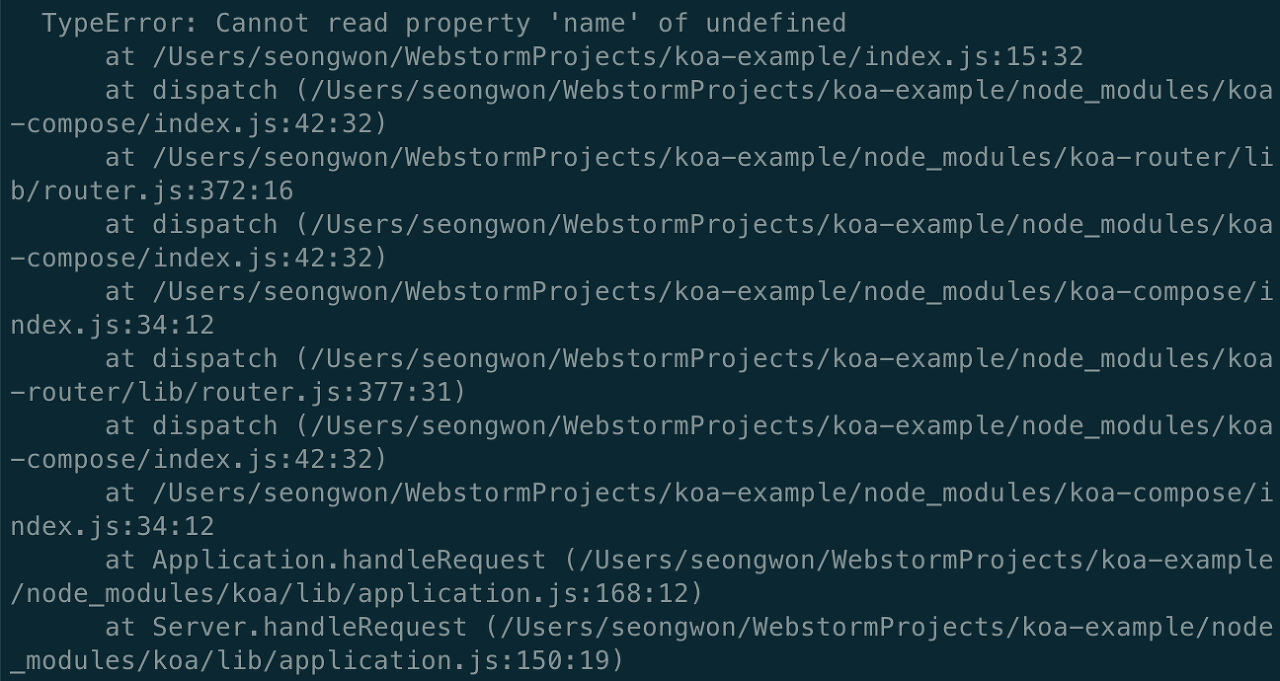 name 속성이 정의되지 않았다는 오류가 출력된 것을 확인할 수 있다. 모듈을 설치 후 코드를 적용하고 다시 요청을 보내보면?