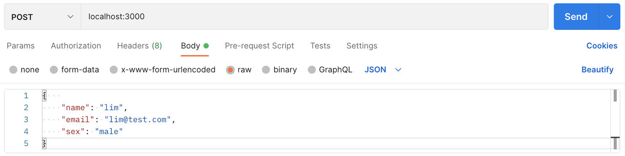 그리고 포스트맨을 이용해서 다음과 같이 Body를 구성 후 요청을 보냈다.