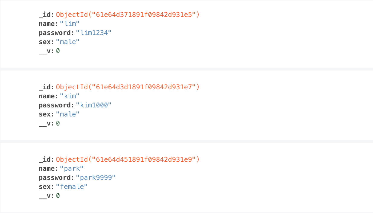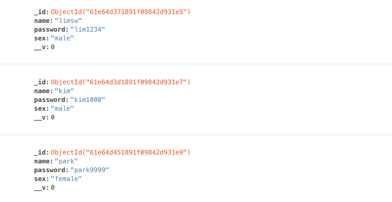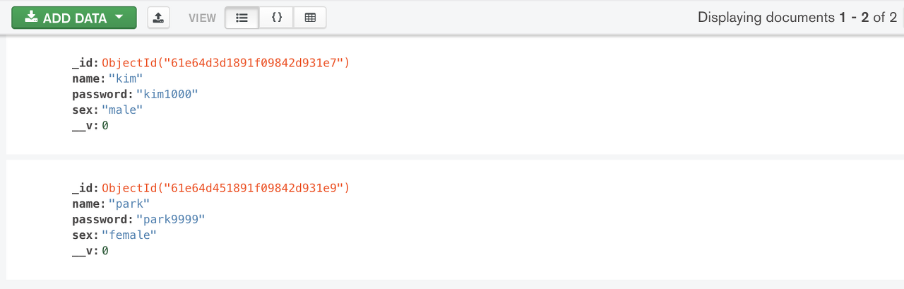현재 스키마는 어떠한 중복 처리도 되지 않았기 때문에 동일한 Document를 저장해도 문제 없이 저장된다. 그러나 실제 프로젝트를 구현할 때는 이메일 중복 체크와 같이 사용자의 유저 정보가 중복되는 일이 없도록 해야한다.