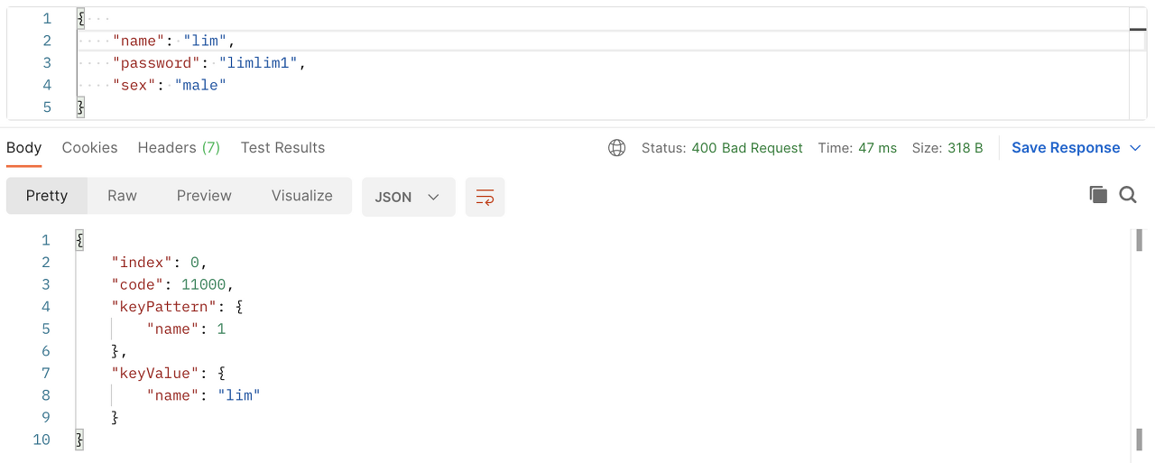 400 Bad Request 에러를 반환한 것을 볼 수 있다. 에러를 살펴보면 name의 값으로 lim이 중복됐다는 것을 확인할 수 있다.