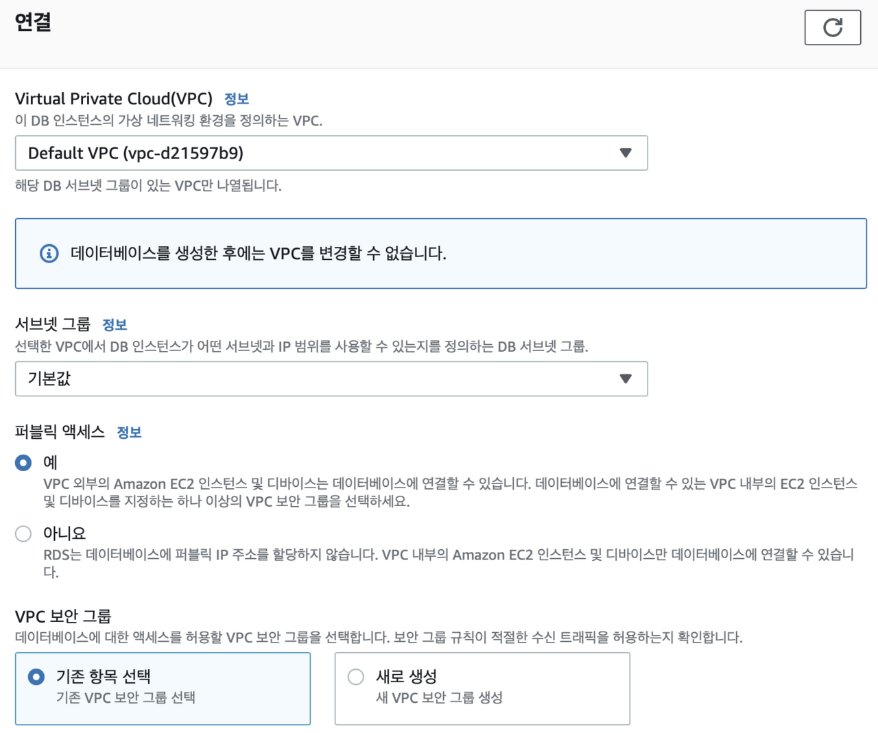 연결 정보는 다음과 같이 구성했다. 퍼블릭 액세스는 예 로 바꾸어 외부에서 데이터베이스에 접근을 허용할 수 있도록 했다.