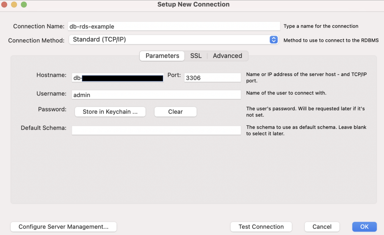 - Connection Name : RDS 생성 시 정의한 데이터베이스 이름 (필자는 db-rds-example로 정의했다.)
