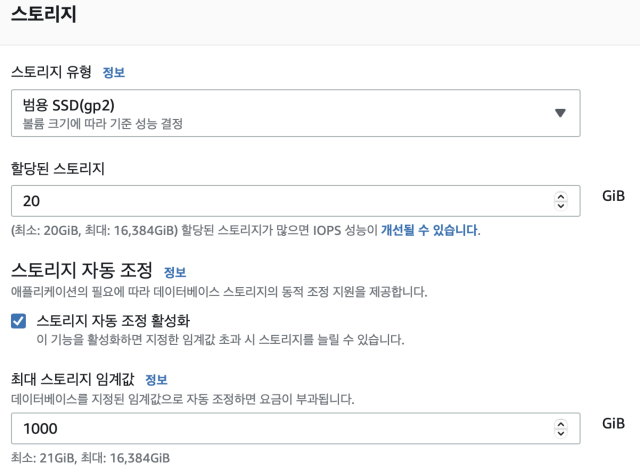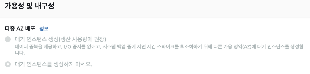 스토리지와 가용 및 내구성 옵션은 따로 건드리지 않고 넘어갔다. 사용자 요구사항에 맞게 스토리지 크기를 조절해도 무방하다.