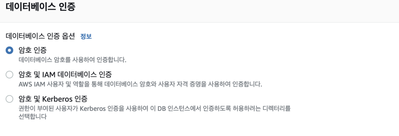 데이터베이스 인증은 암호 인증 으로 선택 후 데이터베이스 생성 을 클릭하여 RDS를 생성한다.