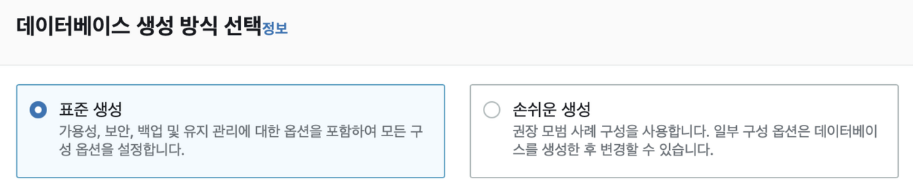 생성 방식은 표준 생성 으로 설정했고 엔진은 Mysql을 사용하였다.