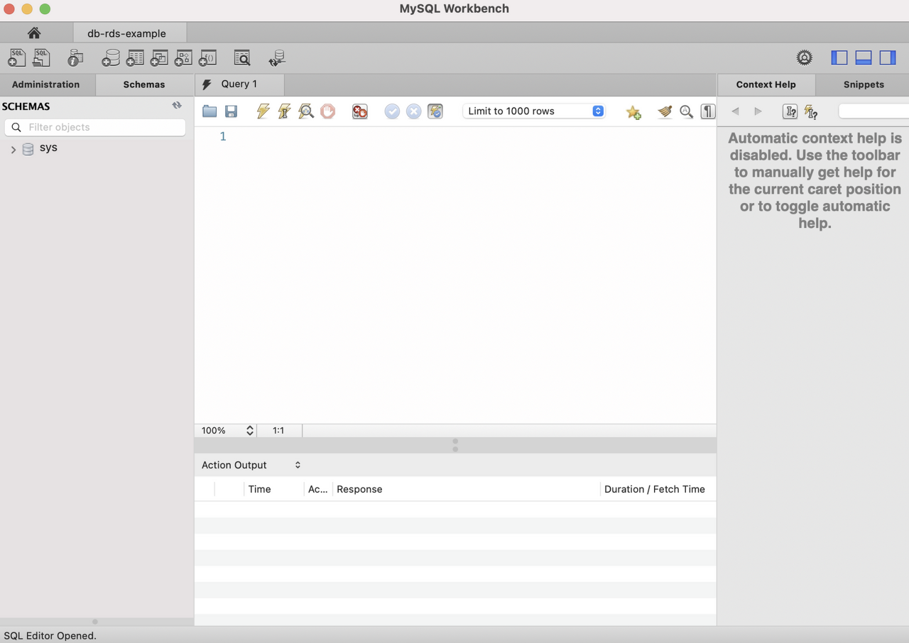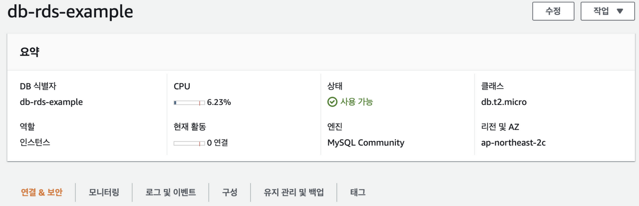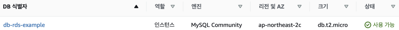 이와 같이 db-rds-example 이름의 데이터베이스가 생성된 것을 확인할 수 있으며 클릭 시 접속할 수 있다.