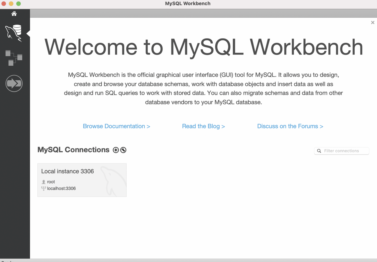 워크벤치를 실행하면 위와 같은 화면이 나온다. MySQL Connections 옆에 + 버튼을 클릭하면 데이터베이스 연결을 위한 셋업 환경 팝업창이 나타난다.
