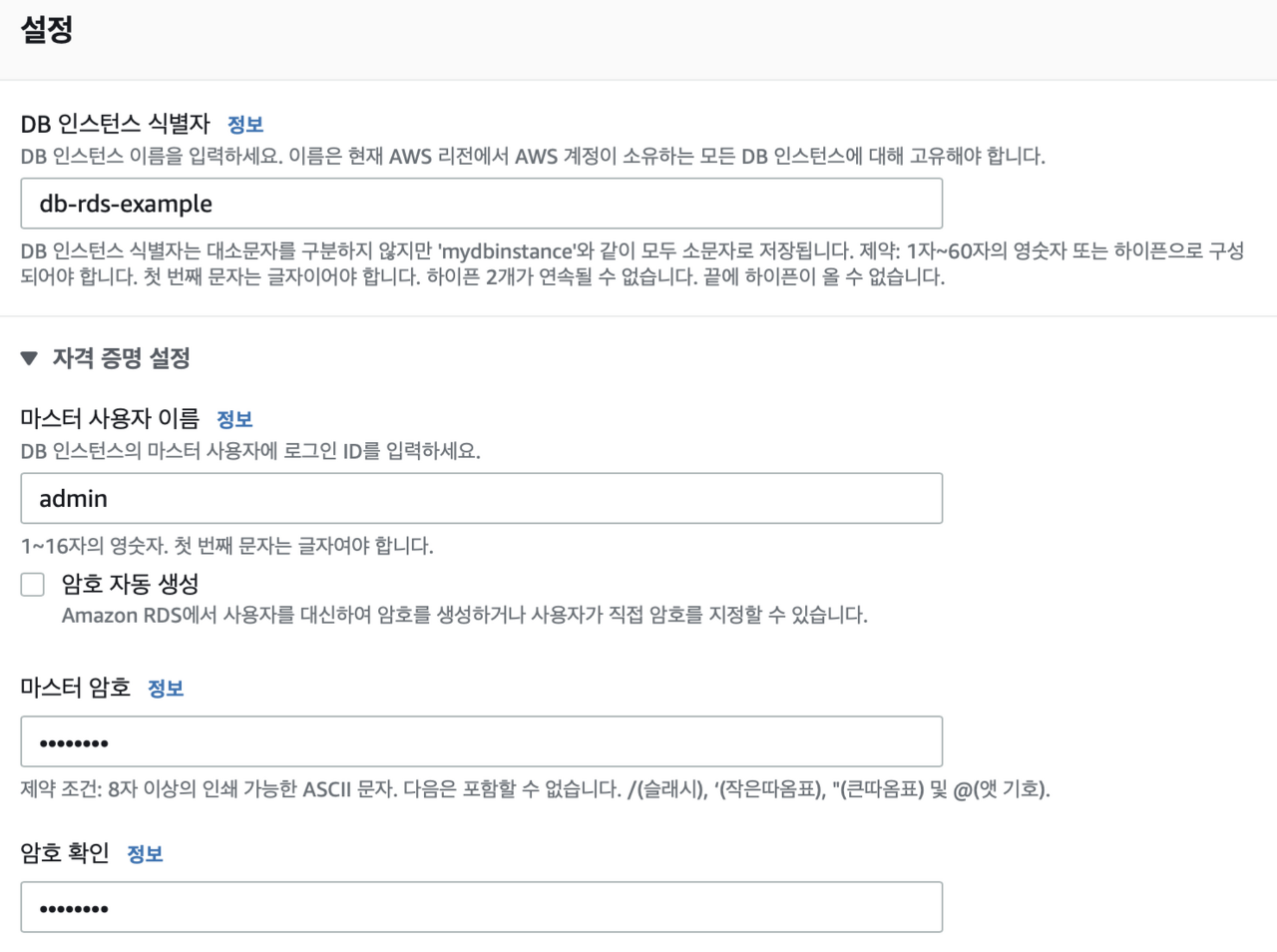 - mymasteruser : 마스터 사용자 이름 입력