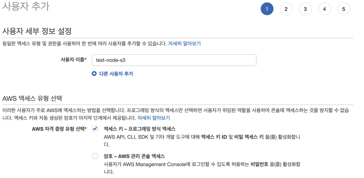 위 과정을 거친 뒤 사용자를 만들면 액세스 키, 비밀 액세스 키 를 할당받는데 2개의 키는 이후 Node.js 에서 AWS S3에 접근할 때 필요하므로 복사하여 가지고 있어야 한다.