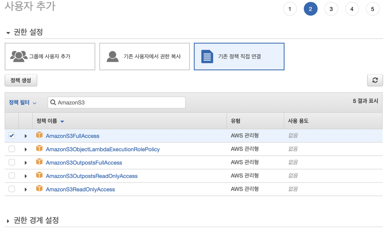 권한 설정에서는 기존 정책 직접 연결 을 선택한 뒤 AmazonS3FullAccess를 선택한다.