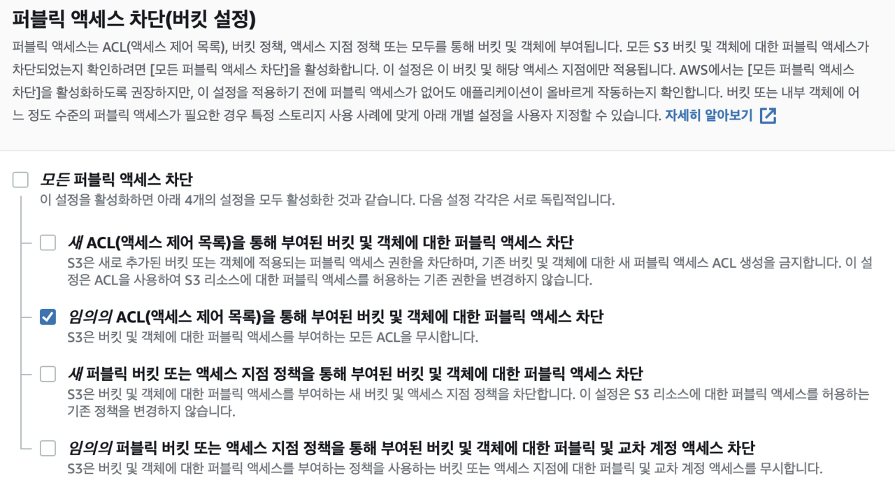 버킷 생성 시 퍼블릭 액세스 차단 설정