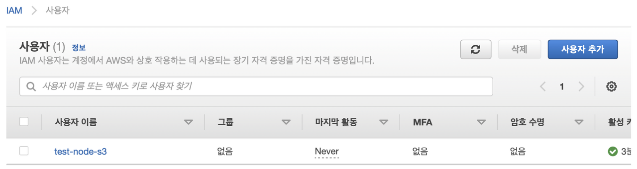 IAM의 사용자 탭으로 들어가보면 사용자가 추가된 것을 확인할 수 있다.