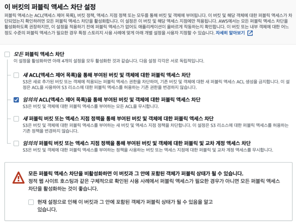 버킷 이름은 유일해야 하며 버킷의 퍼블릭 액세스 차단 권한은 다음 사진과 같이 설정했다.