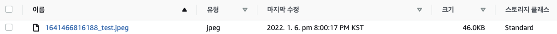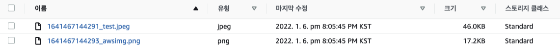 위 사진과 같이 2개 이미지를 업로드 해보았다. 결과는 S3 콘솔을 통해 확인해 보았다.