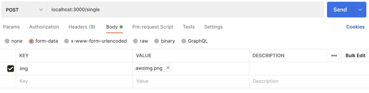 포스트맨을 통해서 먼저 이미지 1개를 업로드 한 경우이다. 위와 같이 KEY값을 img 로 구성 후 업로드 할 이미지를 지정한 뒤 POST 요청을 수행한다. 결과는 다음과 같다.