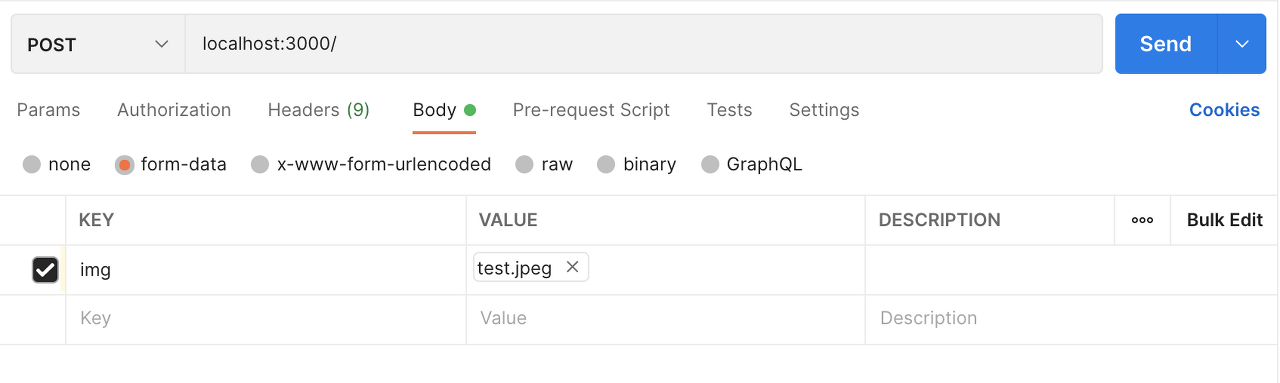 이 때 KEY 의 값은 파일 업로드 코드에서 구현한 upload.single('img') 이 부분의 인자 값과 같아야 한다. 요청 결과는 다음과 같다.